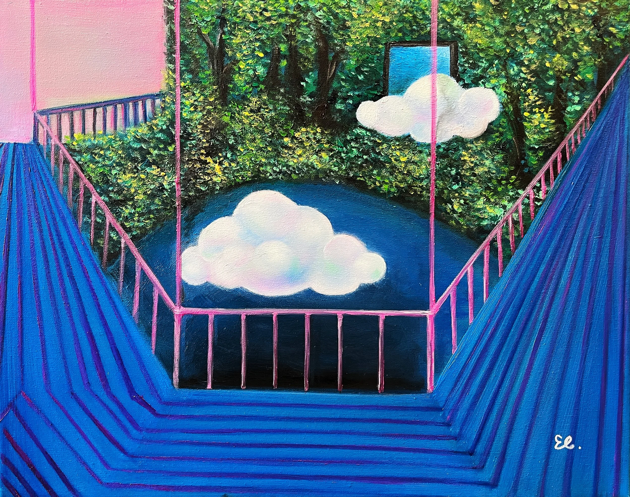 “The Let-In Cloud” presents a daydreaming portal within everyday life, inspired by David Hockney’s structured interiors. A door becomes a threshold admitting a serene cloud. The palette of luminous azure and neon pink operates psychologically (azure as idealised sky, neon pink as artificial/urban), suggesting a healing dialogue between inner self and the outside world. The cloud is a fragile, transient presence in hard modern architecture, representing the choice to let fantasy change the room’s atmosphere as a form of resilience.