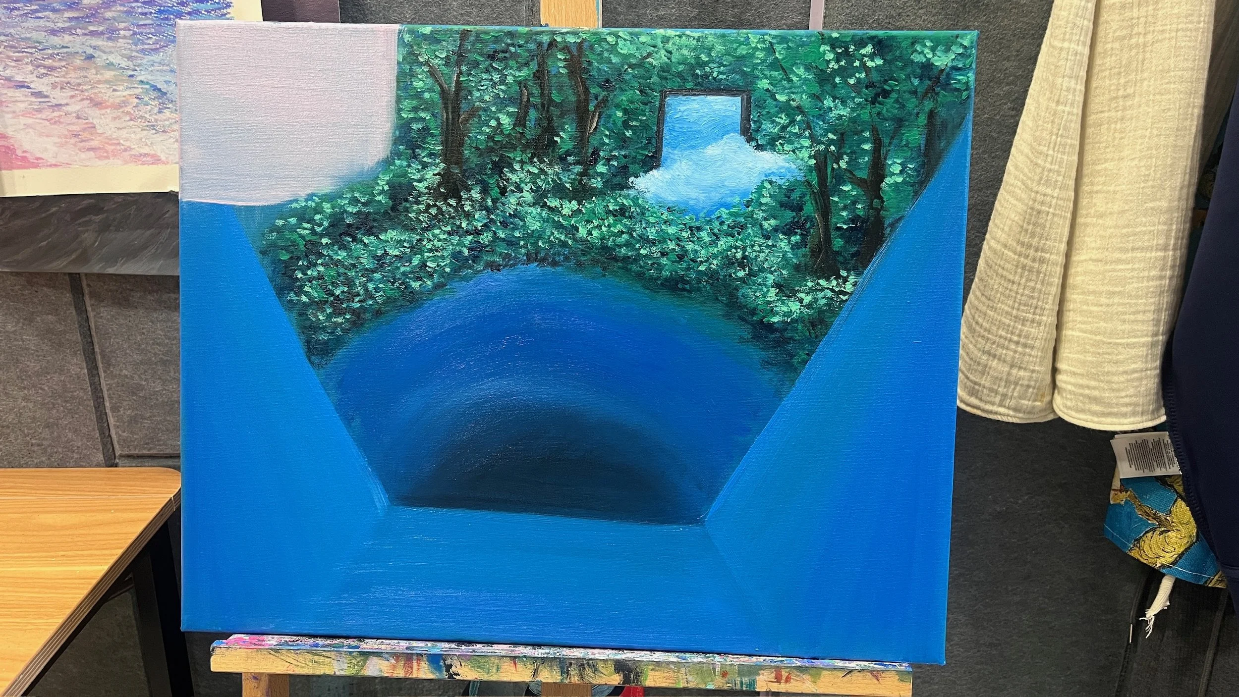 “The Let-In Cloud” constructs a portal for daydreaming within the confines of everyday life. Formally inspired by the structured interiors of David Hockney, the painting depicts a room that willingly breaches its own boundaries. A door, a classic symbol of division, is instead transformed into a threshold of possibility, actively ushering in a vast, serene cloud.